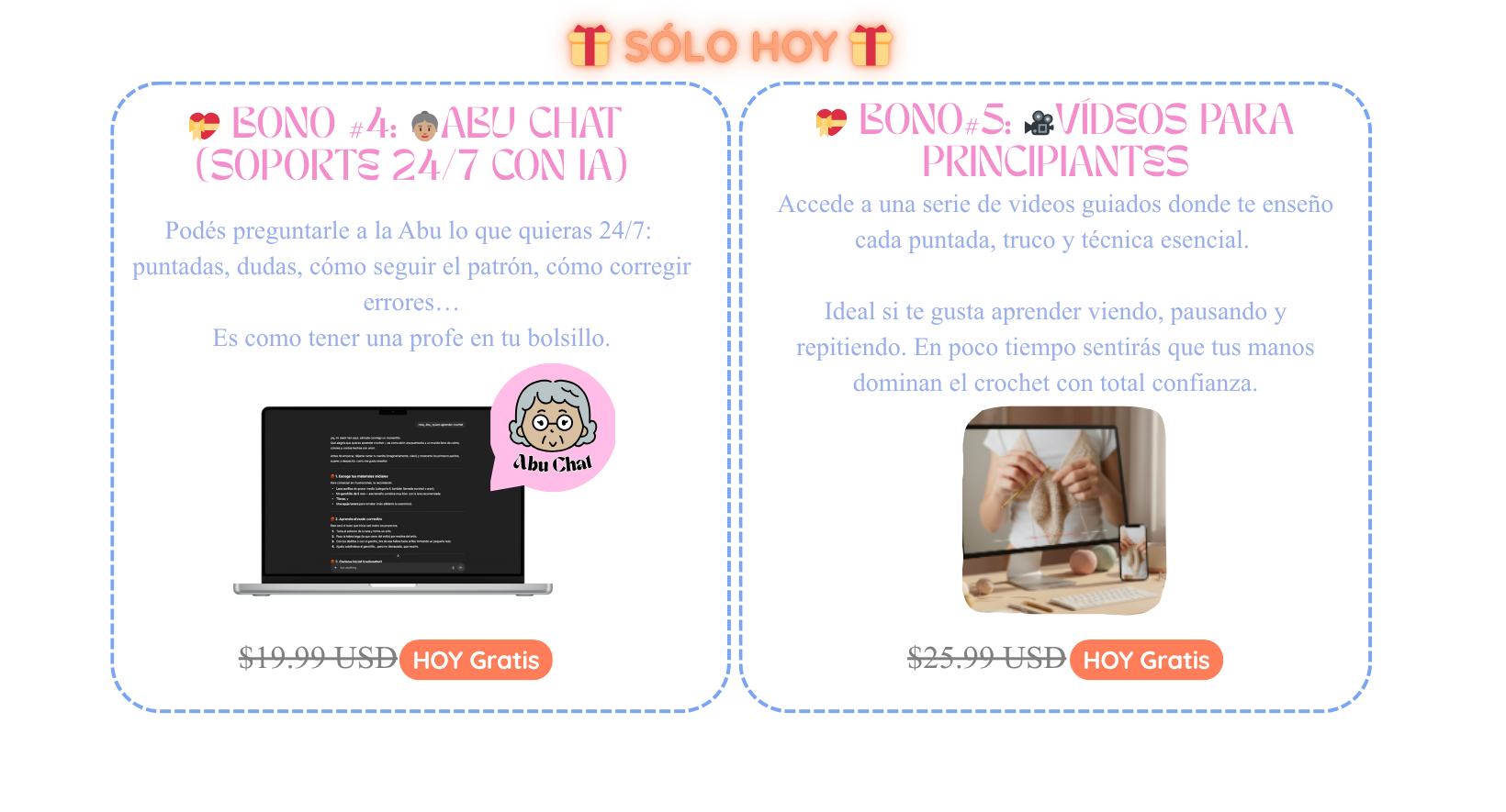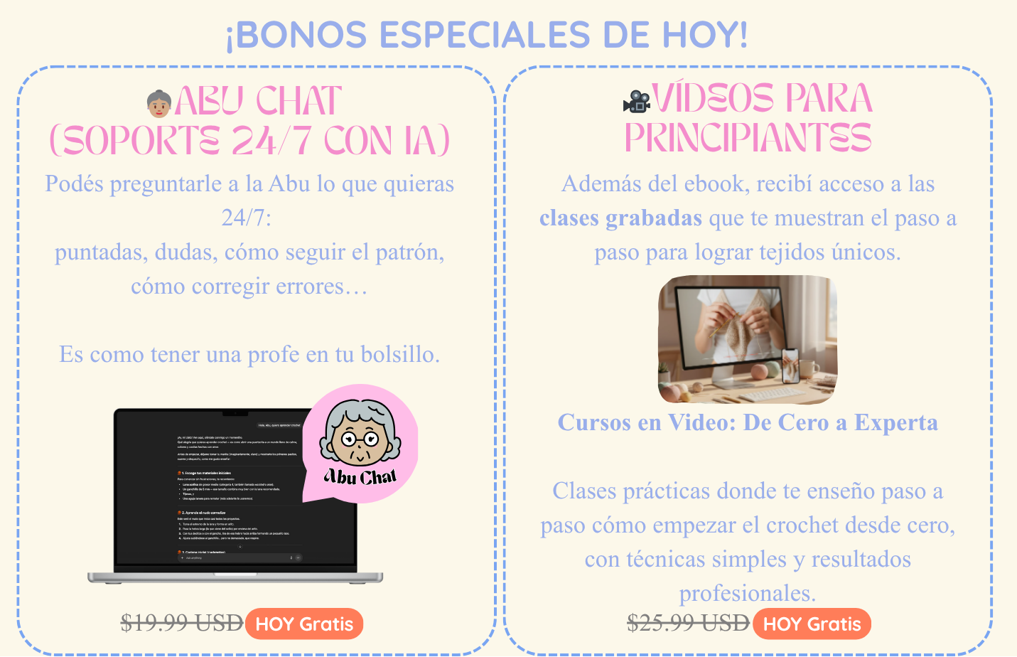 Tenés soporte con el Bono GPT Crochet (La Abu con IA), donde podés preguntar lo que quieras 24/7:
